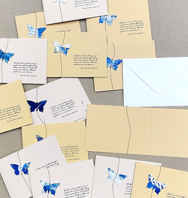 Bestellnummer: 073 Kleine Cyanotypie- Schmetterlinge auf chamois Karton genäht, Text gestempelt: "Leben ist nicht genug, sagte der Schmetterling, Sonnenschein, Freiheit und eine kleine Blume gehören auch dazu." (Hans Christian Adersen) Querformat: DIN A6 |