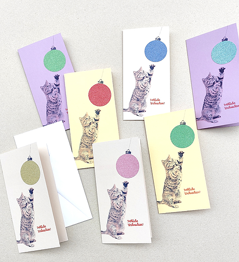 2farbiger Risoprint auf diversen Kartonfarben, aufgeklebte Kugel aus verschiedenem Glitzerkarton